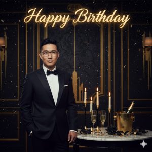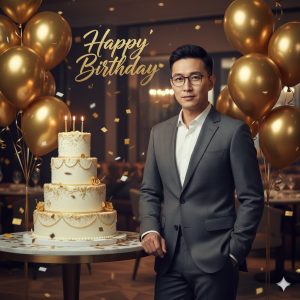 A stylish birthday celebration portrait of [uploaded photo], wearing a modern suit, standing beside a decorated birthday cake with gold balloons and confetti, cinematic lighting, elegant background, Happy Birthday text in stylish font.