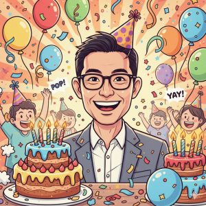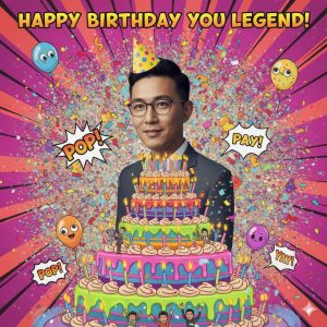 Cartoon-style birthday artwork of [uploaded photo], cheerful atmosphere with colorful balloons, birthday cake, party hats, and comic effects, fun and vibrant illustration.
