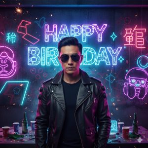 Cool birthday party scene of [uploaded photo], wearing a leather jacket and sunglasses, neon lights, graffiti wall behind, Happy Birthday text glowing in cyberpunk style.