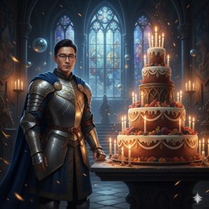 Fantasy-themed birthday portrait of [uploaded photo] as a brave knight celebrating his birthday in a magical castle, glowing candles on a medieval cake, epic lighting.