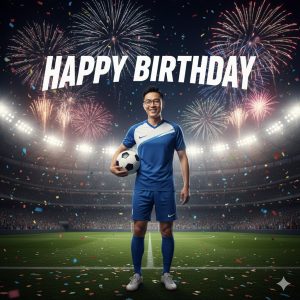 Sports-themed birthday photo of [uploaded photo], holding a soccer ball on a stadium field, fireworks and confetti, Happy Birthday text in bold sporty font.