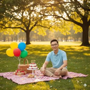 Outdoor birthday picnic scene of [uploaded photo], sitting in a park with balloons, cake, and sunlight filtering through trees, relaxed and natural atmosphere.