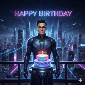 Futuristic sci-fi birthday artwork of [uploaded photo], holographic cake, glowing city skyline, cyber lighting, ‘Happy Birthday’ in neon hologram style.